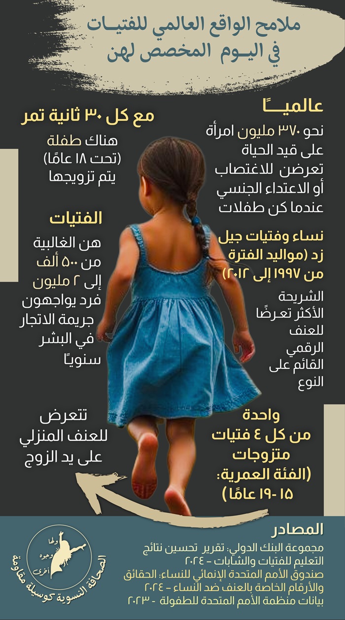 بالتزامن مع إحياء هذه المناسبـة الدوليـة، نضيء على بعض الحقائق والأرقام التي تكشـف أوجه عديدة للعنف الذي تتعرض له الطفلات والفتيات، لا سيما أولئك اللاتي يولدن ويعشن في الجنوب العالمي: